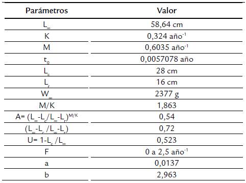 En el periodo 2013-2014 (n=2076), la LE de la doncella capturada osciló entre 7,2 y 50 cm, con promedio de 29,3±7,7 cm (±desviación estándar); mientras que en 2015 (n = 1126), la LE osciló entre 12,4 y 47,8 cm (27,9±6,1 cm). Con los parámetros de crecimiento y mortalidad que se muestran en la tabla 1 se estimaron los diferentes puntos de referencia para la doncella.