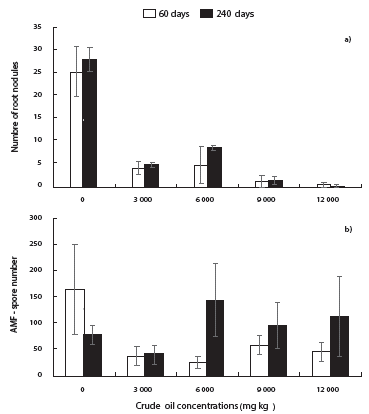 Figure 2: Number of nodules formed by native rhizobia in roots of Clitoria ternatea (a), and number of spores (b) of arbuscular mycorrhizal fungi (AMF) in 100 g of dry soil collected from the rhizosphere of Clitoria ternatea and Brachiaria brizantha grown mesocosms contaminated with four concentrations of crude oil, after 60 and 240 days. Means ± standard error. Mean comparison test (LSD, α=0.05). n = 5.