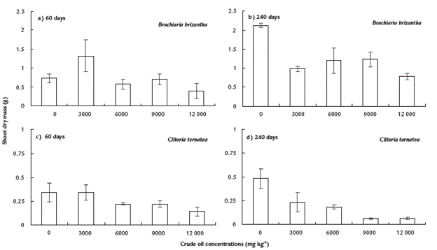 Figure 4: Shoot dry mass of Brachiaria brizantha and Clitoria ternatea grew in mesocosms contaminated with four concentrations of crude oil, after 60 (a and c) and 240 (b and d) days. Means ± standard error. Mean comparison test (LSD, α=0.05). n=5.