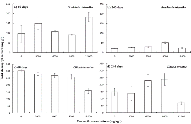 For B. brizantha, total chlorophyll content at 60 days was significantly higher in the treatment with 12000 mg kg-1 when compared to the remaining treatments (a). However, after 240 days, the total chlorophyll content significantly decreased in all treatments, although the significant highest content was obtained in plants exposed to 9000 mg kg-1 (Fig. 5b). For C. ternatea, at 60 days, chlorophyll content decreased significantly as the crude oil concentration increased (Fig. 5c). In contrast, at 240 days, plants grown in treatments with 6000 and 9000 mg kg-1 had significantly higher chlorophyll content than the remaining treatments (Fig. 5d).