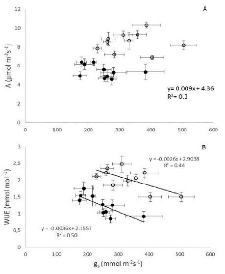 A low positive correlation between A and g was found (R2 = 0.2) (Fig. 2A). Under high and low PPFD, WUE and gs showed a negative linear relationship (R2= 0.44 and 0.50, respectively) (Fig. 2B).