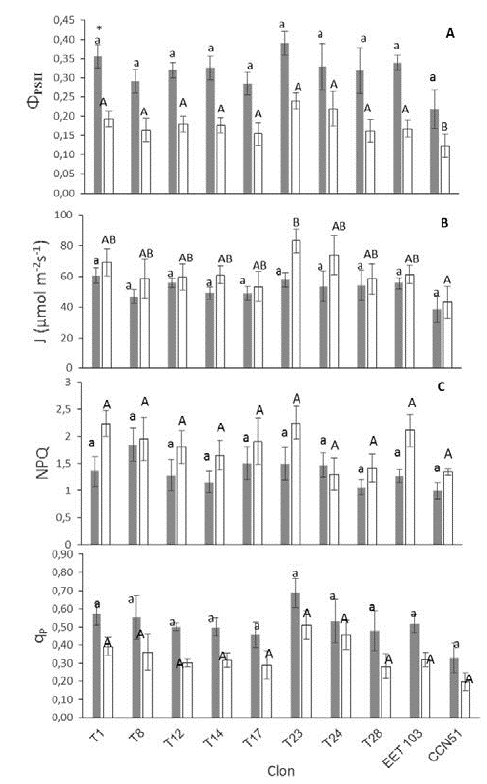 No significant differences between the clones at both high and low PPFD were found for ΦPSII, J, NPQ and qP. In general, all clones showed lower values of ΦPSII and qP in high