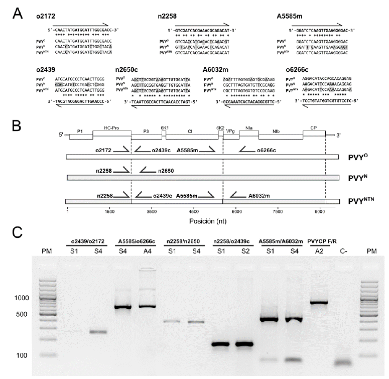 Figura 1: A) Secuencias de los cebadores utilizados para la identificación de tres cepas de PVY en este trabajo. B) Ubicación de los cebadores en el contexto del genoma de PVY. Las líneas punteadas corresponden a los puntos principales de recombinación identificados en este virus. C) Corrido electroforético de los amplicones obtenidos a partir de reacciones de RT-PCR de diferentes muestras de tejido foliar de papa sintomáticas (S) y asintomáticas (A), utilizando cebadores específicos para diferentes cepas de PVY. PM: Marcador de peso molecular de 100 pb. C-: Control negativo.