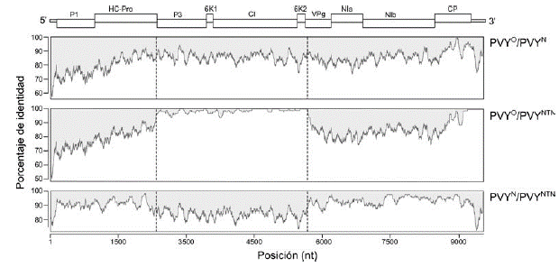 Mediante la secuenciación NGS de las muestras foliares de S. tuberosum, se obtuvieron 7.322.107 reads pareados y un total de 1.479.065.614 nt. Los análisis bioinformáticos con respecto a genomas de referencia, permitieron identificar 171.727 reads como asociados al genoma de PVY; adicionalmente se detectaron reads asociados al crinivirus Potato yellow vein virus (PYVV). Los ensamblajes utilizando Trinity resultaron en tres secuencias consenso que representan las tres cepas (PVYO, PVYN, PVYNTN) detectadas de este virus mediante las pruebas de RT-PCR. El genoma de PVYO tiene una extensión de 9.646 nt con regiones 5'y 3'UTR de 136 y 328 nt, respectivamente y un ORF que codifica para una poliproteína de 3.060 a.a. El genoma de PVYN tiene 9.660 nt, un ORF codificante de una poliproteína de 3.061 a.a y regiones 5'y 3'UTR de 178 y 328 nt, respectivamente. Finalmente, el genoma de PVYNTN presentó 9.691 nt, con un ORF que codifica una poliproteína de 3.061 a.a. y regiones UTR 5'y 3'de 148 y 328 nt, respectivamente. Los niveles de profundidad alcanzados para la secuenciación de estos genomas fueron de 514x 1,039x y 1,994x, respectivamente. Los análisis de BlastX permitieron identificar en los tres genomas las proteínas maduras de los potyvirus: P1, proteinasa HC-Pro, P3, PIPO, 6K1, proteína de inclusión cilíndrica (CI), 6K2, proteína de unión al genoma (VPg), proteinasa de inclusión nuclear (NIa-Pro), replicasa viral (NIb) y proteína de la cápside (CP) (Fig. 3). Los análisis de variación entre las secuencias de nucleótidos de los genomas completos indicaron valores de 83,58% (PVYO vs PVYN), 89,01% (PVYO vs PVYNTN) y 90,47 % (PVYN vs PVYNTN) (Fig. 3); mientras que para la secuencia de aminoácidos de la poliproteína dichos valores fueron de 93,37 % (PVYO vs PVYNTN), 92,88% (PVYO vs PVYNTN) y 96,28% (PVYN vs PVYNTN) (Fig. 3). Estos análisis, también confirmaron la naturaleza recombinante de la cepa PVYNTN identificada en este trabajo, al presentar altos niveles de identidad (>98 %) con respecto a PVYO en la porción central del genoma comprendida entre los RJ HC-Pro/P3 y 6K2/VPg, mientras que los extremos del genoma, aunque más variables, se derivan del genoma de PVYN, tal como se observa en el tercer panel de la figura 3.