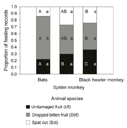 In the present study, the fruit manipulation presented variations according to the mammalian study group, even among the monkeys, the black howler monkeys presented larger proportions of "Uf" than spider monkeys. Likewise, the latter showed larger proportions of "Dbf" with regard to the black howler monkeys. This pattern is consistent with other studies in which it was found that monkeys of the genus Ateles are highly frugivorous to the degree that they are specialists (Di Fiore et al., 2008). Regarding the black howler monkeys, the results support the findings of other studies where A. pigra is considered mainly folivorous (which explains the high "Uf" proportion) (Wallis et al., 2012), but opposite to Garber et al. (2015) who characterize this primate as one species with a balanced diet between leaves and fruits.