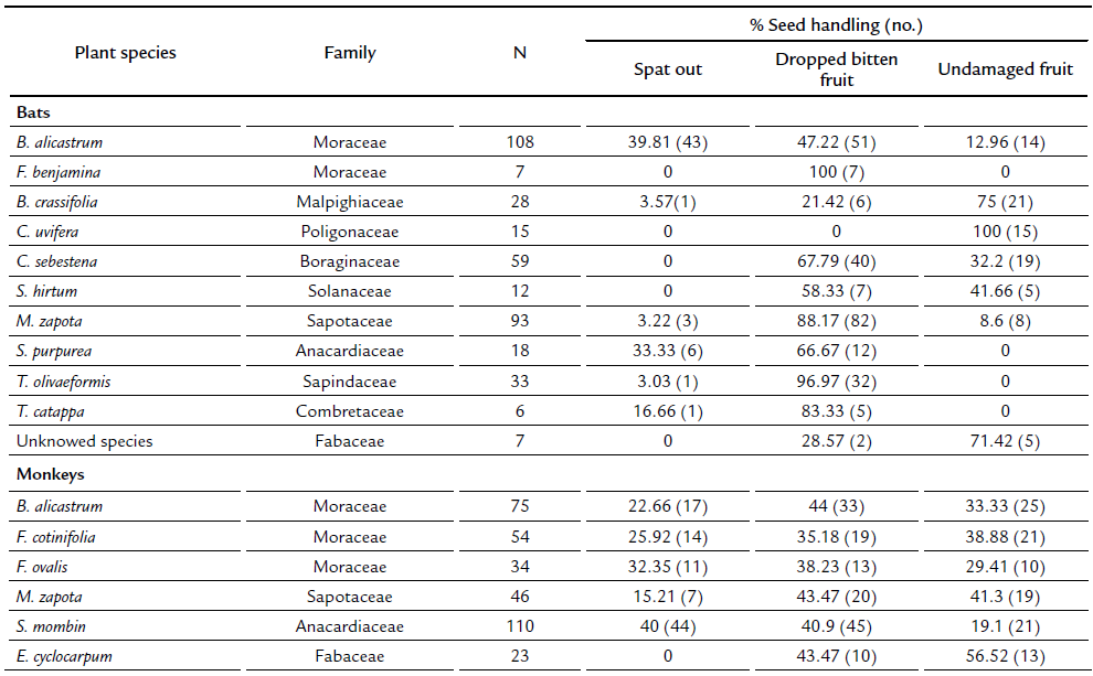 Several studies have analyzed the manipulation of fruit by monkeys in Mexican tropical forests (Chaves et al., 2011; Benítez-Malvido et al., 2014); however, a few of them have studied the fruit choice simultaneously among primates and bats, even considering fruit and seed handling in the association with any particular plant species. The present study is focused on the fruit election of three dispersing agents (primates, A. geoffroyi and A. pigra and frugivorous bats). Three fruit election predictions and the fruit handling associated with frugivorous species were established: 1) based on the foraging behavior of each frugivorous species (Stephens and Krebs, 1986), it would be expected that undamaged fruits and spat-out seeds would be mainly generated by monkeys than by bats and inversely with the dropped bitten fruits. 2) In the absence of fruit that usually eat these dispersors, the main fruit handling associations found would depend of the easiness to eat the fruit (Dominy, 2004). 3) In case dominant plant species are present like Brosimum alicastrum and M. zapota, we would predict a high consumption of those species by the three frugivorous species, with a larger tendency of the bats towards M. zapota owing to the pulp softness (Lambert, 2002), and without expecting any difference between these fruit species for monkeys because of their jaws features (Di Fiore et al., 2008).