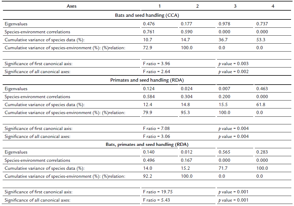 Table 2: Eigenvalues and Monte Carlo results for Canonical Correspondence Analysis (CCA) and Redundancy Analysis (RDA) of fruit choice associated to plant species in bats and monkeys in a neotropical forest, Mexico.