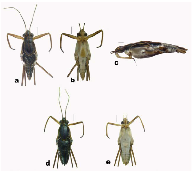 Figura 1: Limnogonus carinatus sp. nov. a-c Macho. a. Vista dorsal. b. Vista ventral. c. Vista lateral. d.-e. Hembra. d. Vista dorsal. e. Vista ventral. Escala 1 mm.