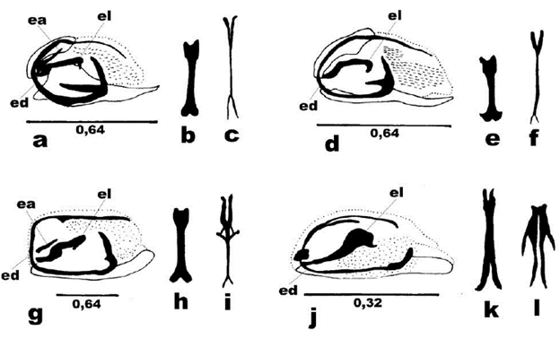j, vésica, vista lateral; k, esclerito dorsal, vista ventral; l. esclerito dorsal, vista dorsal. ea: esclerito accesorio; ed: esclerito dorsal; el: esclerito lateral.