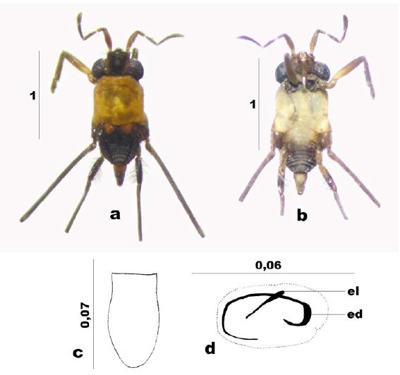 Figura 4: Rheumatobates electricus sp. nov. Macho a. Vista dorsal. b. Vista ventral. c. Proctiger, vista dorsal. d. Escleritos vesicales. el: esclerito lateral, ed: esclerito dorsal.