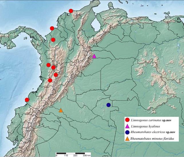 Las especies y subespecies de Rheumatobates Bergroth, 1892 se distribuyen en el nuevo mundo (Hungerford, 1954; Westlake et al., 2000), incluyendo insectos comunes en estanques, lagos, charcas estancadas, canales artificiales, estuarios y manglares (Molano-Rendón et al., 2008; Moreira, 2015). En algunas especies, los machos presentan modificaciones evidentes de las antenas y patas, mientras que las hembras no las presentan (Castro-Vargas y Morales-Castaño, 2011). La revisión taxonómica del género para Colombia fue realizada por Castro-Vargas y Morales-Castaño (2011), quienes registraron diez especies y describieron una nueva. Recientemente, Molano et al. (2017) describieron una nueva especie de manglar y presentaron nuevos registros para el país. En este trabajo se describen dos nuevas especies de los géneros Limnogonus y Rheumatobates para Colombia, se presentan claves de identificación actualizadas para estos géneros, un mapa de distribución para las nuevas especies y nuevos datos para Limnogonus hyalinus (Fabricius, 1803) y Rheumatobates minutus flavidus Drake & Harris, 1942.