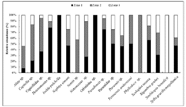 No significant differences were observed in the spatial-temporal distribution of polychaetes. The nMDS plots did not show clear correlations between zones or sampling dates (Fig. 4a, b). The total abundance of polychaetes decreased from the lower mesolittoral to upper mesolittoral areas (Fig. 5a). Among the most abundant species (N. simoni, Notomastus sp., and Paraonis sp.), only N. simoni followed this distribution pattern (Figure 5b). It is noteworthy that Notomastus sp. was associated with an area dominated by R. mangle, particularly in the intermediate mesolittoral (Zone 2), while N. simoni was associated with an area where Avicenniaschaueriana (Stapf and Leechm 1939) was present in the lower mesolittoral (Zone 1) (Fig. 5b).