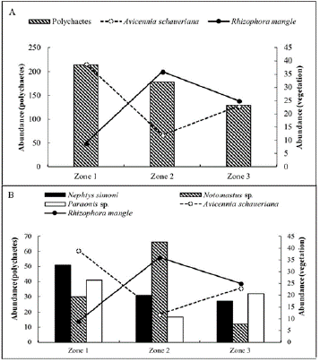 Figure 5: The abundance of polychaetes and types of mangrove in each zone of the mesolittoral (A); and spatial distribution of the most abundant polychaete species and types of mangrove in the Quebra Pote mangrove in Maranhão (B).