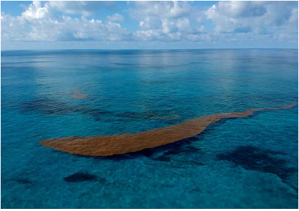 Figure 2: Aerial photo of floating Sargassum reaching Beacon Cay. Photo credits: Santiago Estrada-Robledo.