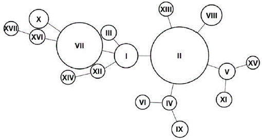 Para conocer qué tipo de relación evolutiva podrían tener los haplotipos observados en la población de estudio se realizó un análisis de networks (Fig. 2). La red resultante muestra al haplotipo I como un haplotipo central de donde derivan dos subredes. Long et al. (1990) clasificaron los haplotipos en el cluster de Beta globina en dos tipos: primer y segundo orden. Los de primer orden difieren en un solo paso de mutación o conversión génica entre ellos; los de segundo orden son productos de eventos de recombinación (Long et al., 1990). El haplotipo I (-----) se encuentra central en la red de haplotipos resultante mostrando su posición como haplotipo ancestral (Chen et al., 1990; Long et al., 1990;). El haplotipo II (-----+) es un haplotipo de primer orden, de este se derivan los haplotipos VIII (- +--+) y XIII (+-+) los cuales son haplotipos de segundo orden. A partir del haplotipo IV (--- + +) se forma una pequeña red con el haplotipo VI (--+ + +) y el haplotipo IX (- +-+ +). El haplotipo VI no ha sido reportado y puede ser producto de recombinación entre haplotipos II y IV. Otra red formada a partir del haplotipo II es la conformada por los haplotipos V, XV, XI. Los dos primeros no han sido reportados, el haplotipo XI, es el haplotipo Camerún, es un haplotipo presente en poblaciones del viejo mundo (Africa, Europa, Asia).