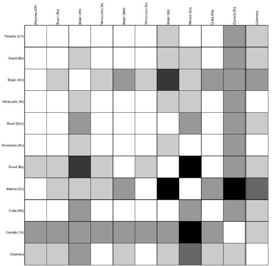 Figura 4: Similitud genética entre la población de afectados de Colombia (estudio actual) y otras poblaciones de afectados de América. Las frecuencias son extraídas de los estudios reportados en la tabla 1. Los cuadros blancos indican menores diferencias genéticas, los cuadros oscuros representan mayores diferencias. Se puede ver como la mayor similitud genética se presenta con las poblaciones de Venezuela y la mayor diferencia se presentó con la población mexicana. Cp= Ciudad de panamá, Ba y Bah= Bahía, Am=Amazonas, Ar= Aragua, Su= Sucre, Be= Belém, Cc= Costa Chica, Ha= La Habana, To= Toronto.