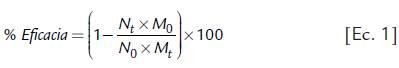 Grado de eficacia (%) de los tratamientos (Ef). El grado de eficacia fue determinado considerando la relación matemática de Henderson y Tilton (1955), descrita a continuación: