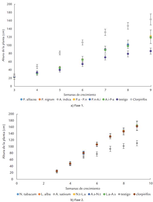 Los datos de AP promedio obtenidos para los cultivos de la fase 1 se registran en la Figura 2a. En esta Figura se observa que mientras que la máxima altura promedio de las plantas tratadas con los extractos y sus mezclas estuvieron entre 118,5 ± 14,4 y 121,7 ± 13,0 cm; la altura del grupo testigo fue de 85,8 ± 7,4 cm, lo que representa una diferencia de 34,9 cm. Los valores de AP de las plantas tratadas con los diferentes extractos y mezclas en la última semana no tuvieron diferencias significativas entre sí (p>0,05). Algo similar se presentó durante la fase 2 con las plantas sometidas a otros tratamientos (véase Fig. 2b), donde se observa que mientras las máximas alturas promedios de las plantas tratadas estuvieron de igual manera entre 161,7 ± 17,2 y 165,6 ± 13,8 cm; la máxima altura del grupo testigo fue de 110,7 ±7,9 cm. No hubo diferencia significativa (p>0,05) en las AP tratadas con los bioplaguicidas entre sí y las tratadas con clorpirifos; sin embargo, si hubo diferencia comparada con el grupo testigo lo que indica la efectividad de los biotratamientos. Las plantas tratadas para cada fase crecieron proporcionalmente en función del aumento de las semanas. El crecimiento de las plantas de los grupos testigos siempre estuvo por debajo de las plantas tratadas con los extractos vegetales y el clorpirifos.
