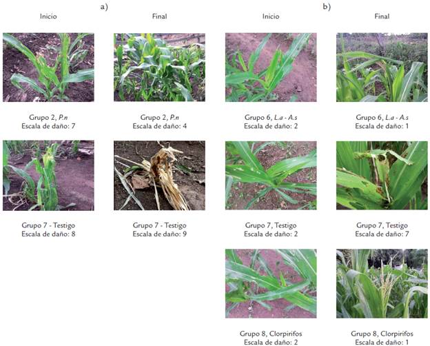El registro del número de larvas encontradas en el cultivo antes y después de la aplicación de los tratamientos se presenta en la Tabla 2. En todos los grupos experimentales se observó una disminución de la población de las larvas después de los tratamientos, contrario a los grupos testigo que mostraron un gran aumento en la población de S. frugiperda. Esto podría sugerir que los tratamientos usados no sólo presentan actividad biológica contra las larvas de S. frugiperda, sino también evitaron que los huevos eclosionaran. A pesar de que las condiciones de campo hacen difícil medir un Ei de las larvas, si se pudo observar una recuperación de las hojas de las plantas tratadas y una disminución de las larvas.