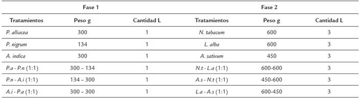 Los extractos vegetales se prepararon usando hojas, bulbillos o semillas de las plantas mezcladas en agua destilada. Las hojas de A. indica (300 g), P. alliacea (300 g), L. alba (600 g) y N. tabacum (600 g) se recortaron en trozos de 2 cm, aproximadamente, se maceraron y mezclaron de forma separada en agua destilada (1-3 L) durante 24 h en ausencia de luz. Este mismo procedimiento se siguió para preparar el extracto de las semillas secas de P. nigrum (134 g) y de bulbillos de A. sativum (450 g). Adicionalmente, se prepararon mezclas de estos extractos en proporciones 1:1 para cada fase estudiada (Tabla 1). Los extractos y sus mezclas se filtraron antes de su aplicación por aspersión en los cultivos de maíz.