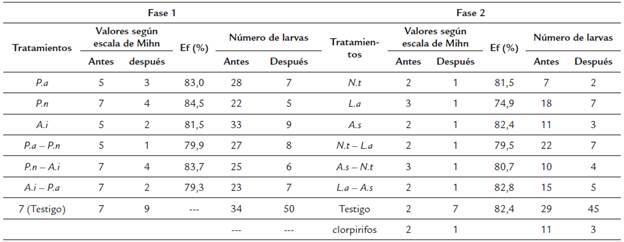 Todos los tratamientos presentaron diferencia significativa respecto al control. S2 P.a = 271,7; S2 A.i = 208,6; S2 P.n = 230,3; S2 P.a - P.n = 174,9; S2 A.i - P-n = 228,4; S2 P.a - A.i = 196,0; S2 control = 54,4; F P.a-control = 4,99; F A.i-Control = 3,83; F P.n-control = 4,23; F (P.a-P.n) -control = 3,21; F (A.i-P.n)-Control = 4,20; F (P.n-P.a)-control = 3,60. S2 N.t = 204,6; S2 L.a = 295,0; S2 A.s = 191,6; S2 clorpirifos = 188,2; S2 N.t - L.a = 162,9; S2 A.s - N.t = 251,7; S2 L.a - A.s = 214,1; S2 control = 61,7; F N.t -control = 3,31; F L.a - Control = 4,78; F N.t - control = 3,10; F clorpirifos - control = 3.05; F (N.t - L.a) -control = 2,64; F (A.s - N.t)-Control = 4,08; F (L.a - A.s)-control = 3,47.
