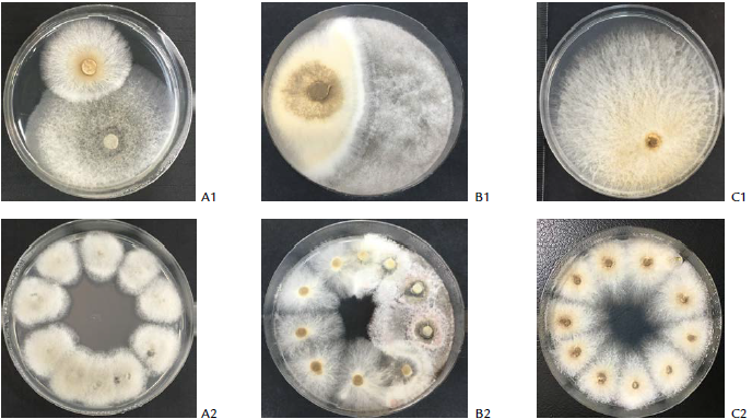 Figure 1: Examples of dual cultures of M. roreri vs. endophytes after eight days of incubation (A1-C1). A1, vs. strain Ec107 (C. gloeosporioides; B1, vs. strain Ec129 (N. sphaerica) and C1, pathogen alone. Re-isolation (survival) of the “winner” fungi from the agar-plugs extracted throughout the colony-contact areas (A2-C2). Series 2 shows plates with 0, 50 and 100 % of survival of M. roreri after the confrontations, respectively.
