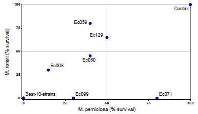 Figure 2: Percentage of survival of M. roreri and M. perniciosa after 13 days of confrontation with endophytic strains in dual-culture-assays. The values were determined based on the number of disc that showed growth of the pathogens when extracted from the interaction zone of the endophyte-pathogen colonies. The lower %-value, the more mycoparasitic capacity of the endophytes. The 10 best isolates are represented by a point with 0 %-0 %. Colonies were cultivated on PDA (26° C/darkness), and two replicates and 20 discs per treatment were used.