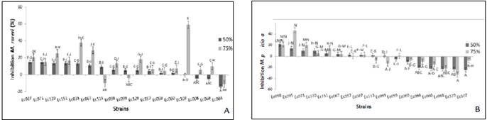 Crude extracts of the metabolites from liquid Czapeck medium at 25° C ± 2 for 21 days. Negative values indicate stimulation of the pathogen respects to the control (PDA without the metabolites). Different letters indicate significant differences (p <0.01).