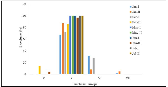 When assessing the dynamics of the biovolume of the MBFGs throughout the study period, Group V showed a high fidelity, being present in ten samples. Group V was also the dominant group, its biovolume accounting for more than 65 % in each studied month. In contrast, Group IV was present in five samples and groups VI and VII occurred in four of the samples. Group VII appeared in less than 5 % of all samples, whereas Group VI reached 31 % of the total biovolume for January and 27 % for February (Fig. 3).