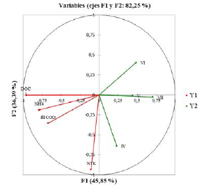 The first two factors of the CCA factorial decomposition summarized the variables analysed. They accounted for 82.3 % of the total observed variability (F1 36.3 % and F2 45.8 %). Figure 4 shows the simultaneous representation of a set of Y1 and Y2 variables in the two factorial axes. The two factors, F1 and F2, display a negative relationship with all the variables of the study. The graph also shows that the biovolumes of MBFGs V and VII relate to the periods during which the pond had low levels of DOC. The biovolumes of the MBFG VI related to low levels of fil COD and NH4+. Additionally, the biovolume of IV relate to TKN increases in the pond.