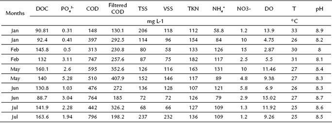 Table 2: Physicochemical variables in the HRAP during the study period. Where: DOC (Dissolved organic carbon), PO43- (Phosphates), COD (Total chemical oxygen demand), Filtered COD (chemical oxygen demand in the filtered water), TSS (total suspended solids), VSS (volatile suspended solids), TKN (total Kjeldahl nitrogen), NH4+ (ammoniacal nitrogen), NO3- (nitrates), DO (dissolved oxygen) and T (temperature).