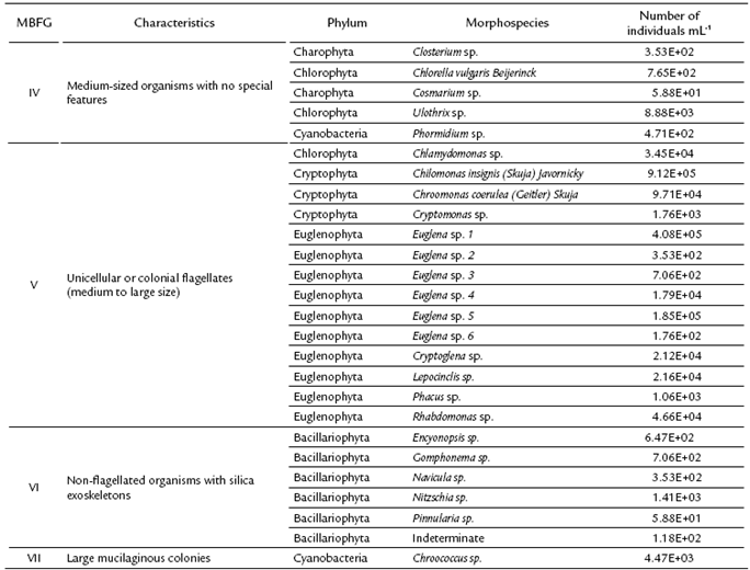 Overall, 26 morphospecies were recorded, distributed into six phyla and 20 genera (Table 3). Among the seven MBFGs proposed by Kruk et al. (2010), only four groups (IV, V, IV and VII) were found in the HRAP (Table 3). Of these MBFGs, Group V exhibited the largest number of species (14), followed by Group VI (six), Group IV (five) and VII had one specie. When considering abundance alone, Group V was dominant throughout the study period, accounting for 98 % of the total individuals sampled. In terms of biovolume, Group V exhibited the same dominant pattern (Fig. 2).