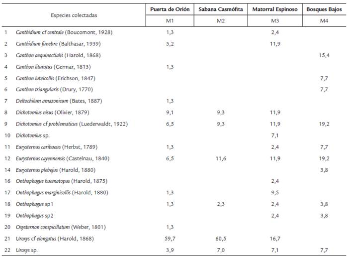 Las dos especies reconocidas del género Dichotomius se colectaron en la mayoría de las estaciones de muestreo: Dichotomius nisus en las estaciones M1, M2 y M3 y Dichotomius cfproblematicus en todas las cuatro; otra especie no identificada del género se colectó solo en la estación ubicada en los matorrales espinosos (M3). El género Dichotomius (Hope, 1838) es muy diverso en Colombia; a la fecha se han registrado 32 especies (Sarmiento y Amat, 2014), aunque un gran número de ejemplares sin identificación reposan en muchas colecciones entomológicas. D. nisus se ha registrado en los departamentos de Casanare, Cundinamarca, Guainía, Meta y Vichada hasta los 1200 m.s.n.m., mientras que D. problematicus tan solo en los Departamentos de Guaviare y Meta en alturas menores a los 350 m.s.n.m. (Escobar, 2000; Medina et al., 2001; Medina y Pulido, 2009) y en la Serranía de Chiribiquete (Pulido et al., 2003).