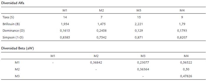Tabla 2: Estimadores de Diversidad Alfa y Beta para los puntos de muestreo de escarabajos coprófagos en la Serranía de La Lindosa-Guaviare.