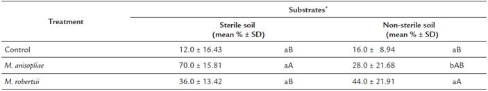 In non-sterile soil, the M. robertsii isolate caused higher mortality than in control. Curiously, the mortality caused by the M. anisopliae isolate in non-sterile soil was only 28 %, which was not significantly different in relation to the control treatment. This difference was also not observed when comparing the mortality caused by the two Metarhzium isolates in non-sterile soil (Table 1).