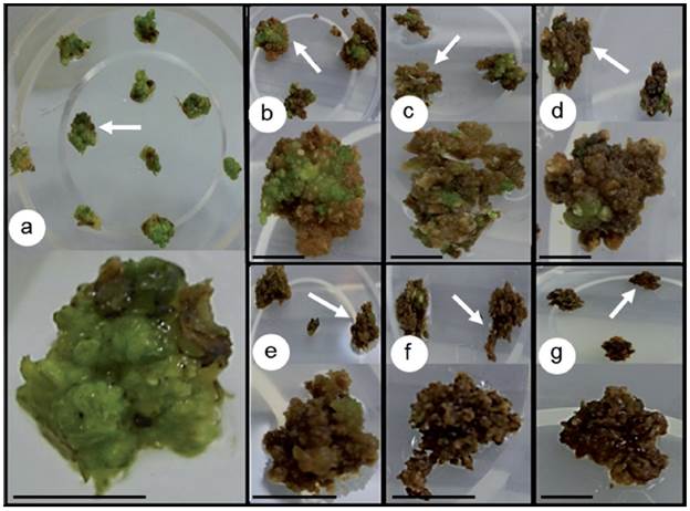Figura 1: Coloración presentada por los callos irradiados de P. vulgaris cultivar "ICA Pijao". a) Control, b) 10Gy, c) 20Gy, d) 30Gy e) 40Gy, f) 50Gy, g) 60Gy. Las flechas indican la coloración del callo cuya imagen aparece ampliada en la parte inferior de cada figura. (Barra=0,5cm).