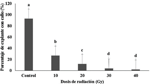 Figura 3: Porcentaje de nudo cotiledonal (NC-1) irradiado que formaron callo de P. vulgaris cultivar "ICA Pijao" a los 21 días en medio de cultivo de formación de callos. Rangos medios con letras desiguales difieren según prueba H de Kruskal Wallis y la U de Mann Whitney p ≤ 0.05