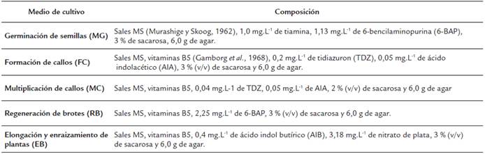 Para el desarrollo de los experimentos in vitro se empleó el esquema de trabajo desarrollado por (Collado et al., 2013), los medios de cultivo empleados en la investigación se describen en la Tabla 1. El pH de los diferentes medios de cultivo fue ajustado a 5,7 con hidróxido de sodio NaOH (0,1N) y cloruro de hidrógeno HCl (0,1N) antes de la esterilización en autoclave a una temperatura de 121 °C y 1,2 Kg.cm-2 de presión, durante 20 minutos. Para los experimentos se utilizaron magentas plásticas de 500 ml de capacidad total y se añadieron 60 ml de medio de cultivo por frasco de cultivo. La manipulación de los explantes se llevó a cabo en cabina de flujo laminar horizontal.