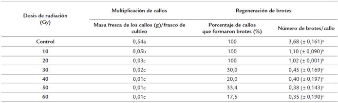 Valdéz et al. (2004), por su parte evaluaron el efecto de diferentes dosis de radiaciones gamma (10, 20, 30, 40, 50, 60, 70, 80 Gy), inferiores a las empleadas en el presente trabajo, en callos de caña de azúcar (Saccharum spp.) y obtuvieron como resultado que la masa fresca de los callos, se redujo a medida que aumentó la dosis de radiación hasta la dosis de 30 Gy.