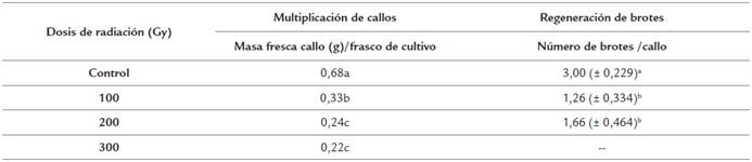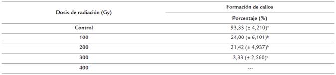 Con la dosis de 100 y 200 Gy se alcanzaron valores similares en la formación de callos a partir de semillas irradiadas y estos valores fueron inferiores al 25 %. Sin embargo con 300 Gy se alcanzaron valores inferiores en el porcentaje de formación de callos con diferencias significativas con 100, 200 Gy y el control. Con 400 Gy no se logró la formación de callos (Tabla 4).