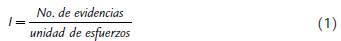 Las abundancias se calcularon (Fórmula 1), al dividir el número de evidencias (sin contar los registros de las cámaras trampa) encontradas para los diferentes senderos entre la distancia recorrida sobre dicho sendero, siendo esta la unidad de esfuerzo. Para esto, se dividió la red de caminos en los diferentes senderos que se encontraban en cada cobertura vegetal o categoría de distancia sobre el gradiente, y se calculó la abundancia relativa para cada sendero, con los datos de observaciones independientes de evidencias encontradas en los mismos (Carrillo et al., 2000; Orjuela y Jiménez, 2004).