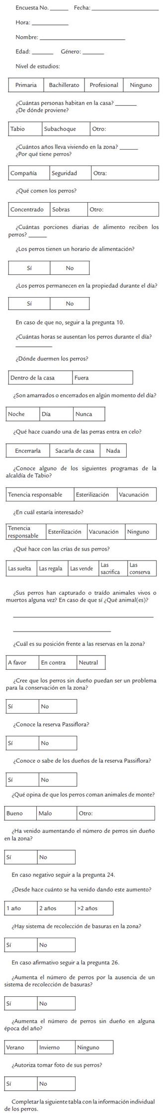 Además, se realizaron 33 encuestas, semi estructuradas (Anexo 1), a dueños de perros del área rural circundante a la zona de reserva, en un radio de 500 m, con el propósito de identificar los perros presentes y compararlos con los registros de las cámaras trampas; entender el punto de vista de los dueños sobre los esfuerzos de conservación y el impacto de los perros en las reservas.