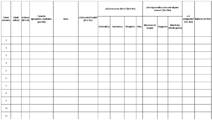 Se visitaron 36 casas con perros, logrando hacer 33 entrevistas efectivas. Con lo que se encontró un total de 84 perros en las casas, y se obtuvo información de 73 de ellos; con un promedio de 2 ± 1,4 perros por casa. Según lo dicho por los dueños, ningún perro recibe comida insuficiente, concordando con que ninguno mostraba rasgos aparentes de desnutrición.