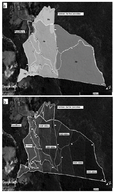 Figura 1: a. Coberturas vegetales en las áreas de Passiflora y Carmen de los Juncales, ubicadas en la vereda El Salitre, del municipio de Tabio (Cundinamarca): Pi. Zona de plantas exóticas, Bs. Zona de bosque andino secundario, Bp. Zona de bosque andino conservado. Además, se muestran los senderos presentes dentro de cada cobertura y las localizaciones de las cámaras trampa (flechas) (Google Earth, Modificado por Estévez y Rodríguez, 2016). b. Gradiente asumido de presencia humana en las RSC Passiflora y Carmen de los Juncales: La zona de mayor presencia (0-100 m) se muestra de color claro, y la de menor (>500-600 m) es la más oscura. Además, se muestran los senderos de ambas RSC que pertenecen a cada categoría cobertura y las localizaciones de las cámaras trampa (flechas) (Google Earth, Modificado por Estévez y Rodríguez, 2016).