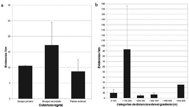En cuanto a la comparación de las abundancias sobre el gradiente, el valor máximo de abundancia (93 069 evidencias/ km) fue el hallado para la categoría de distancia de entre >100 y 200 m de distancia al límite de la zona de reserva desde el cual se asumió el gradiente; y la menor abundancia (0 evidencias/m) encontrada fue entre > 400 y 500 m (Fig. 2b).