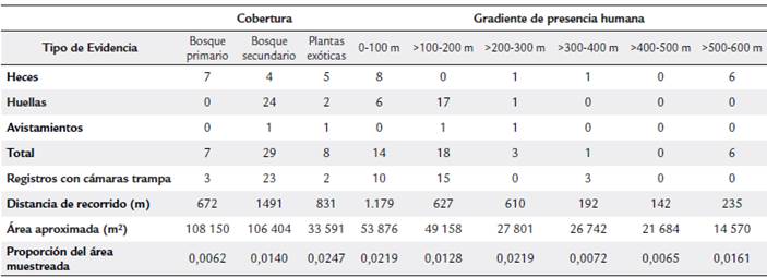 La mayoría de las evidencias (29) fueron encontradas en la cobertura de bosque secundario (Tabla 1) y con respecto al gradiente de presencia humana, en la categoría de distancia de entre >100 y 200 m (Tabla 1).
