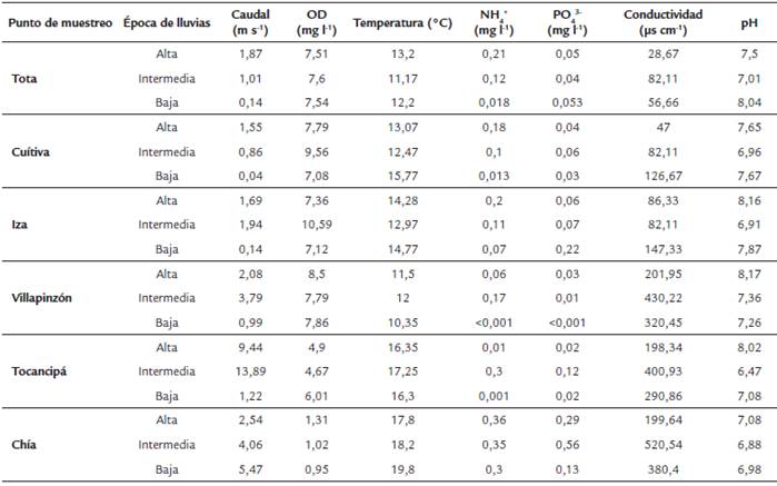 Los valores de los fisicoquímicos registrados en el río Tota se muestran en la Tabla 1. El oxígeno disuelto presentó un valor máximo de 10,59 mg l-1 en Iza con tendencia a la disminución de 7,08 mg l-1 en Cuítiva. La temperatura máxima se registró en Cuítiva con un valor de 15,77 °C en época de poca lluvia (febrero 2008) y una mínima de 11,17 °C en Tota en época intermedia (agosto 2007). Respecto a la conductividad presentó un valor de 147,33 μs cm-1 en Iza y un valor mínimo de 28,67 μs cm-1 en Tota donde las perturbaciones ocurridas son menores a las generadas en la zona media y baja del río.