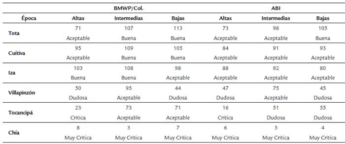 El BMWP/Col. en el río Tota mostró que la calidad del agua en la parte alta, media y baja fue "buena"; sin embargo, el ABI cambió en las tres zonas a una calidad de agua "aceptable". El BMWP/Col. en el curso alto del río Bogotá, Villapinzón presentó una calidad de agua "dudosa", Tocancipá una calidad de agua "aceptable" y Chía una calidad de agua "muy crítica"; mientras con el ABI Villapinzón y Tocancipá cambiaron a una calidad de agua "dudosa" y Chía a una calidad de agua "muy crítica", definiendo así que el ABI es más eficaz para determinar la calidad del agua en ríos altoandinos por encima de los 2000 m.s.n.m.