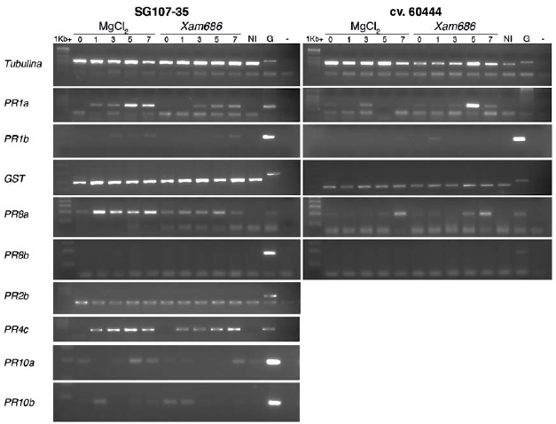 Figura 3: Cinética de expresión de varios genes PR en las variedades resistentes (SG107-35) y susceptible (cv.60444) a lo largo del tiempo tras la inoculación con la bacteria Xam686. NI: No inoculado; G: control de ADN genómico.