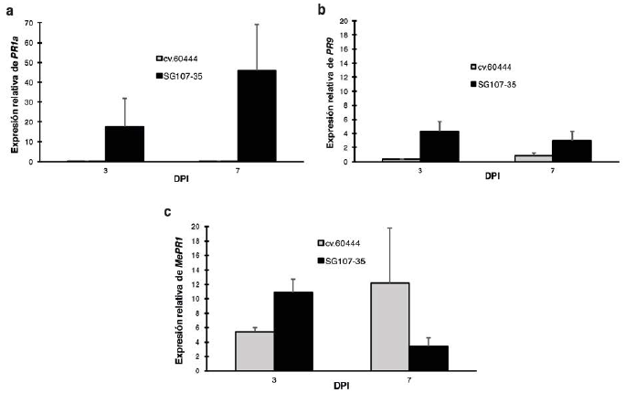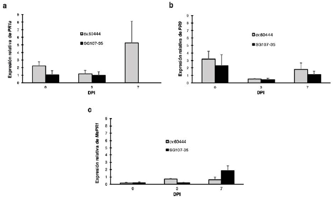 Con el fin de evaluar la expresión relativa de PR1a, PR9 y MePR1 en respuesta a la inoculación con Xam, se comparó la expresión de cada gen a lo largo del tiempo en ambas variedades con respecto a 0 dpi. Los resultados indican que la expresión de PR1a mostró un perfil interesante donde se observa claramente una inducción a los 3 dpi exclusivamente en la variedad resistente, incrementando su expresión a los 7 dpi (Fig. 4a).
